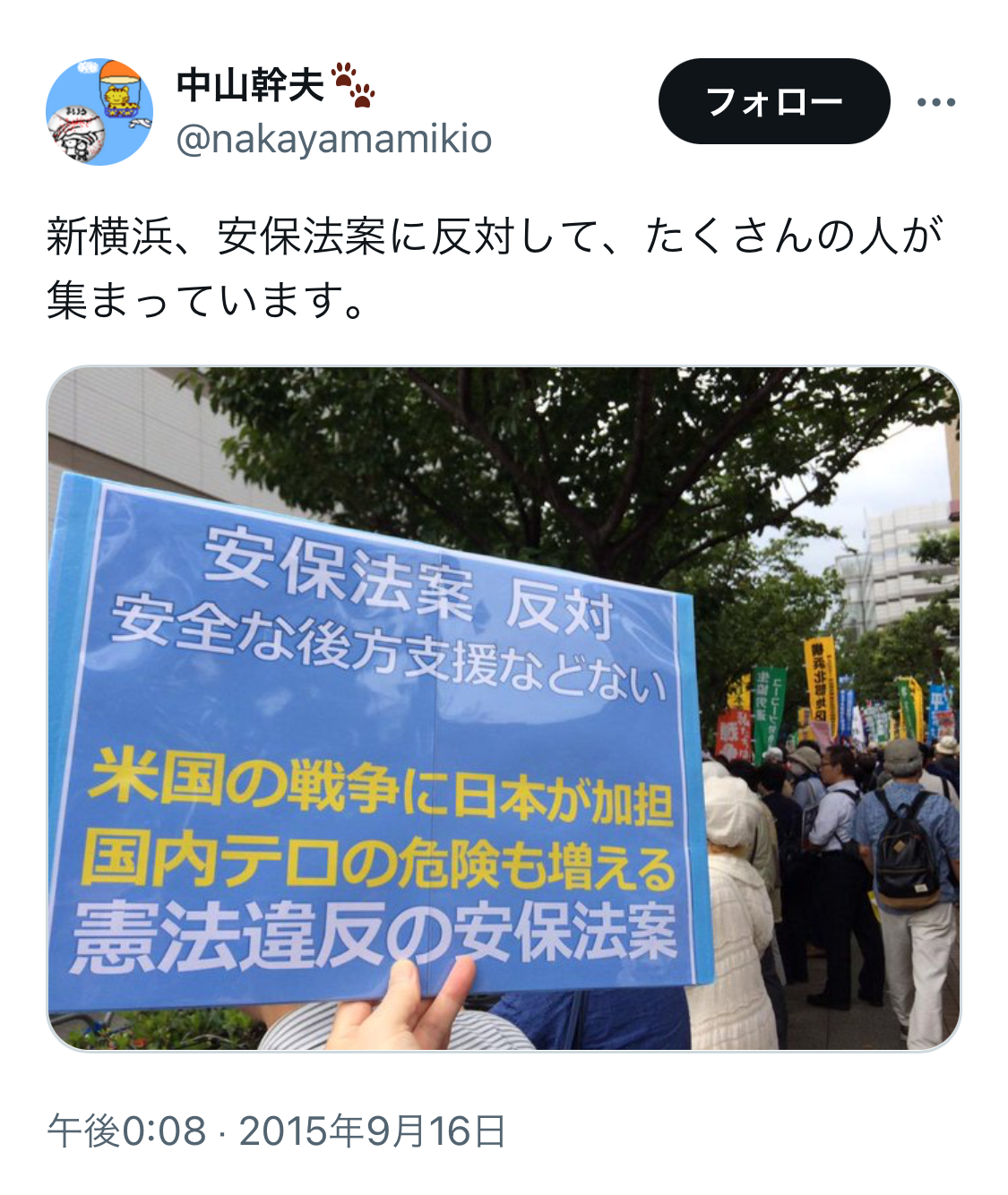 - 2015年~ 2015.5 憲法集会、2015.9 安保法反対デモ、2015.9 新横浜公聴会